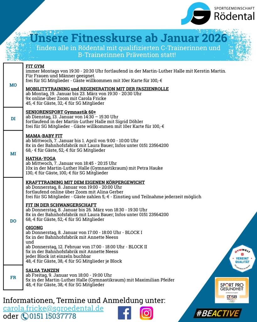 Gleich im neuen Jahr starten wir mit einem tollen Angebot an Kursen. Neu dabei ist Qi Gong und Salsa tanzen, aber auch wieder Yoga, Fit Gym, Mobility und Seniorensport sowie Angebote für Schwangere und Mama mit Baby.
