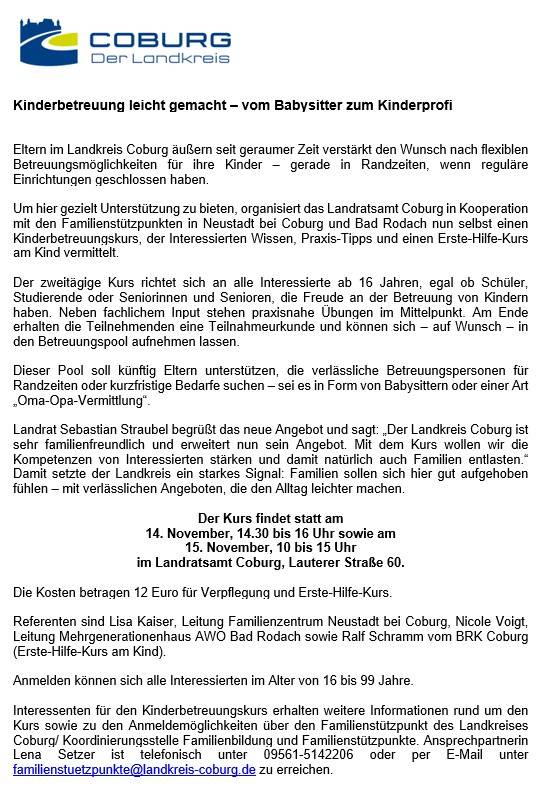 Um hier gezielt Unterstützung zu bieten, organisiert das Landratsamt Coburg in Kooperation mit den Familienstützpunkten in Neustadt bei Coburg und Bad Rodach nun selbst einen Kinderbetreuungskurs, der Interessierten Wissen, Praxis-Tipps und einen Erste-Hilfe-Kurs am Kind vermittelt.