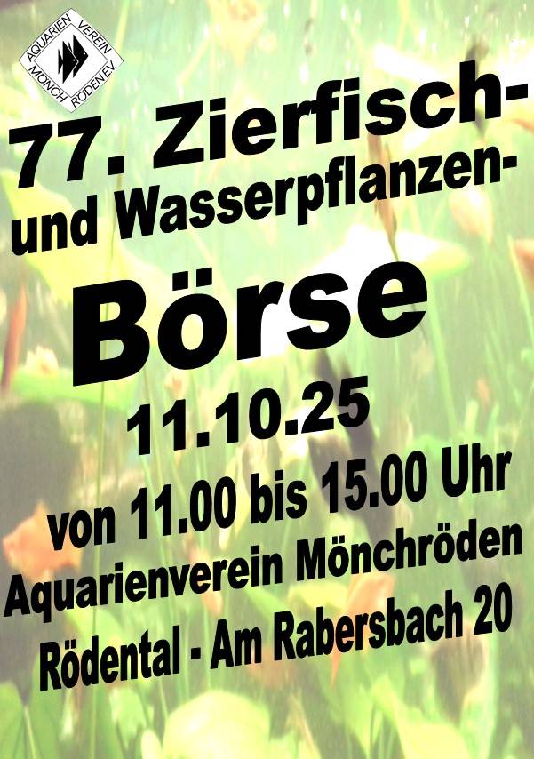 Der Aquarienverein Mönchröden lädt am 11.10.2025 zur 77. Zierfisch- und Wasserpflanzenbörse ins Vereinsheim, Am Rabersbach 20, in Mönchröden ein.