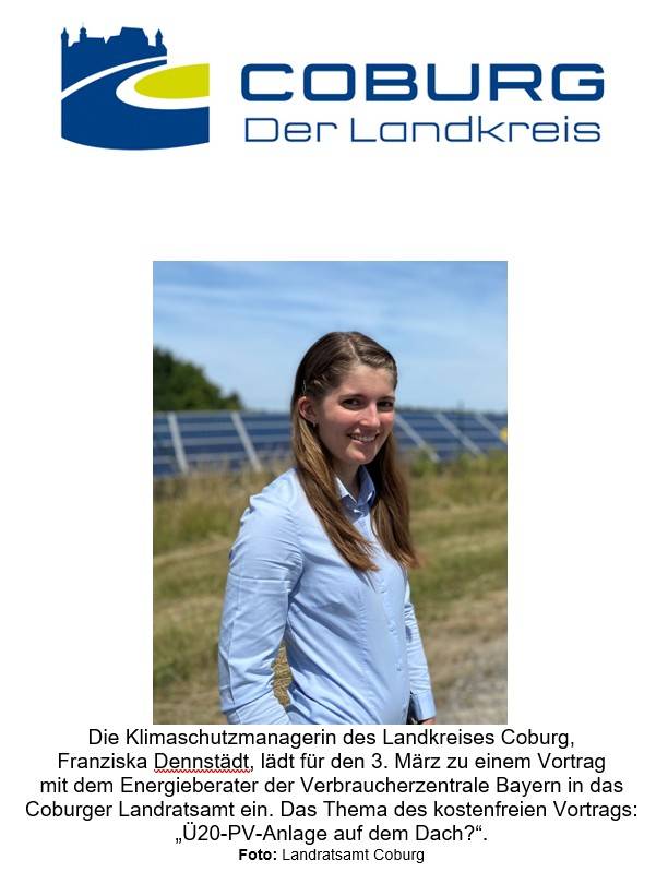 Auf Einladung der Klimaschutzmanagerin des Landkreises Coburg, Franziska Dennstädt, wird am 3. März ab 18.30 Uhr der Energieberater der Verbraucherzentrale Bayern, Alexander Bächer, im Landratsamt referieren. Das Thema des kostenfreien Vortrags: „Ü20-PV-Anlage auf dem Dach?“.