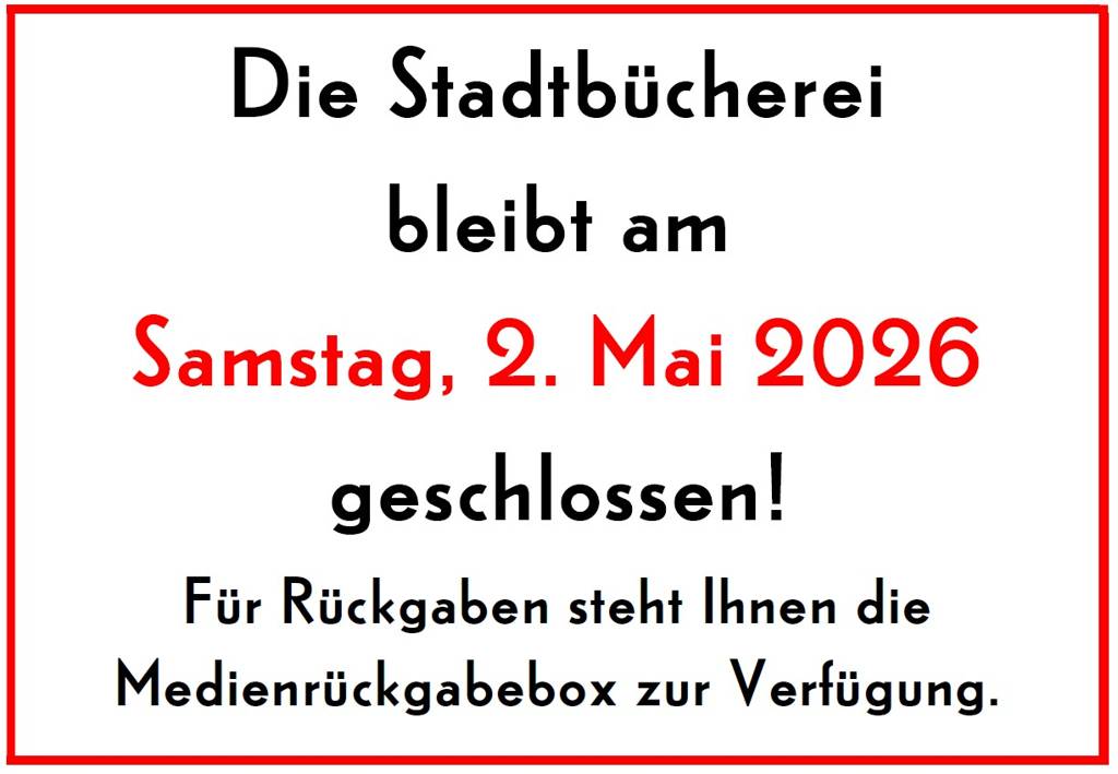 Bitte beachten Sie, dass unsere Stadtbücherei am Samstag, 2. Mai 2026 geschlossen bleibt.