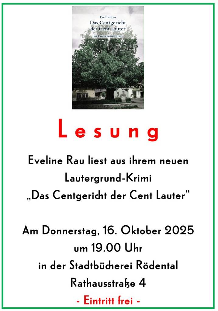 Die Lautertaler Krimi-Schriftstellerin Eveline Rau liest am Donnerstag, 16. Oktober 2025 um 19.00 Uhr in der Stadtbücherei, Rathausstraße 4, aus ihrem neuen Heimatkrimi „Das Centgericht der Cent Lauter“. Der Eintritt ist frei.