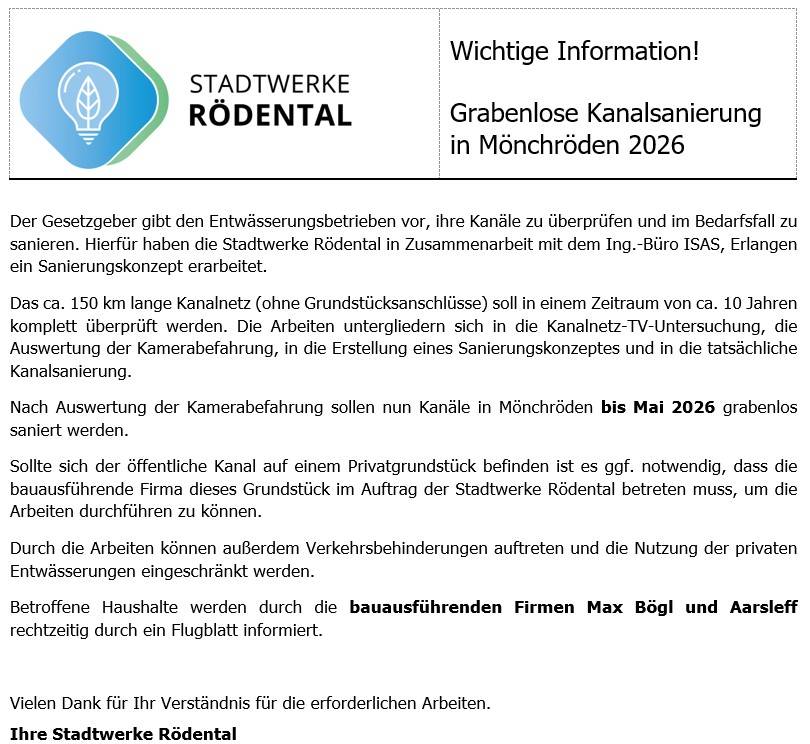 Sollte sich der öffentliche Kanal auf einem Privatgrundstück befinden ist es ggf. notwendig, dass die bauausführende Firma dieses Grundstück im Auftrag der Stadtwerke Rödental betreten muss, um die Arbeiten durchführen zu können.