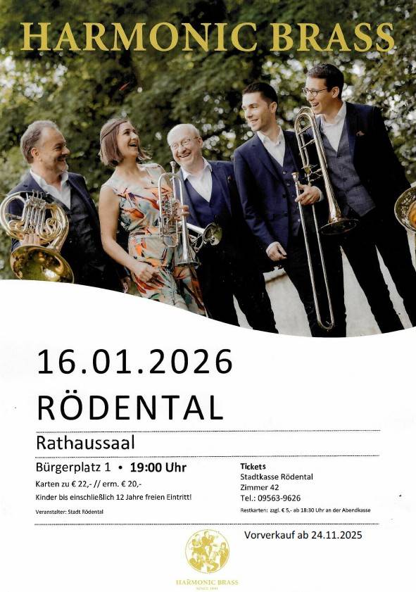 Sichern Sie sich die letzten Eintrittskarten für das Konzert von Harmonic Brass am FREITAG, 16. Januar 2026, im Rathaussaal Rödental.