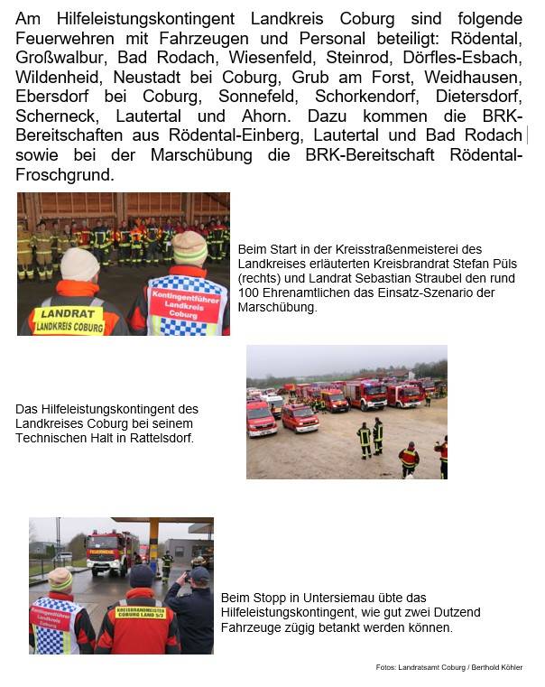 Über 100 Einsatzkräfte der Feuerwehren, des Bayerischen Roten Kreuzes und des Katastrophenschutzes sind die Hauptakteure einer großen Marschübung des Katastrophenschutzes im Landkreis Coburg gewesen. 30 Fahrzeuge waren dabei als lange Kolonne in den Landkreisen Coburg, Lichtenfels und Bamberg unterwegs. Ziel dabei war es, die Abläufe der Fahrt in einer Kolonne im normalen Straßenverkehr sowie den Ablauf eines gemeinsamen Tankvorganges abzustimmen.