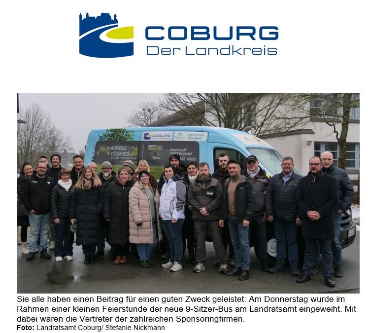 Mit einer kleinen Feierstunde wurde Mitte Januar die Vertreter der regionalen Firmen gewürdigt, die über eine Sponsoringmaßnahme die Anschaffung eines neuen Fahrzeuges am Landratsamt Coburg ermöglicht haben. Der 9-Sitzer Ford Transit soll bereits am Februar im Bereich der Kommunalen Jugendarbeit und der Seniorenarbeit im Landkreis eingesetzt werden.