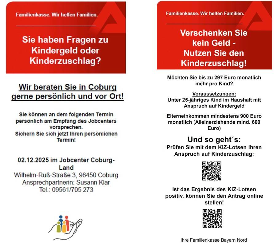 Dabei können alle Fragen zum Kindergeld oder Kinderzuschlag gestellt werden, Anspruch auf Leistungen vorrechnen oder die Anträge direkt stellen. Um Zugänge zu vereinfachen, erfolgt die Beratung für Familien aus der Stadt Coburg und dem Landkreis mit und ohne Termin direkt mit einem Mitarbeiter der Familienkasse.