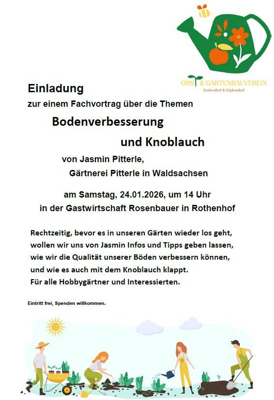 Alle Hobbygärtner und Interessierten sind herzlich zum Fachvortrag zu den Themen Bodenverbesserung und Knoblauch am 24.01.2026 in die Gastwirtschaft Rosenbauer eingeladen.