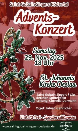 Die Saint-Gobain Singers Rödental laden herzlich zum Adventskonzert am 29. November 2025 in die St. Johannis Kirche Oeslau ein.