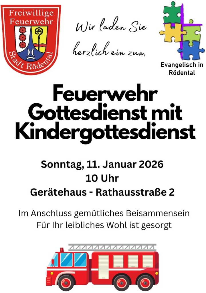 Alle Rödentaler Bürgerinnen und Bürger sind herzlich zum Feuerwehrgottesdienst mit Kindergottesdienst am Sonntag, 11. Januar 2026, um 10.00 Uhr ins Gerätehaus Rathausstraße 2 eingeladen.