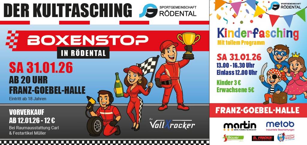 Der Kinderfasching der SG Rödental geht von 13.00 bis 16.30 Uhr mit tollem Programm in die nächste Runde! Einlass ist bereits ab 12.00 Uhr.