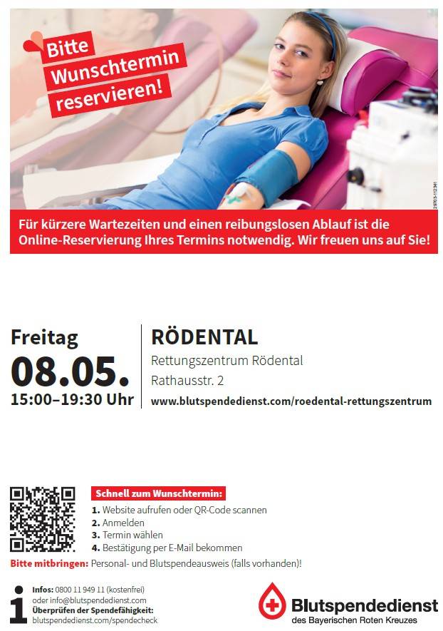 Nächste Blutspende in Rödental am 08. Mai im Rettungszentrum Rödental, Rathausstraße 2.